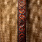 Burnt orange, pewter and black Madrid design with black seatbelt backing, black leather tab ends, and chrome plated metal components. Fully adjustable between 33"-60".