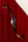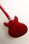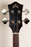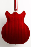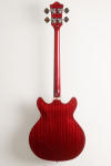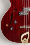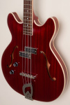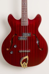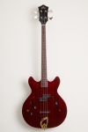 This left-handed bass features semi-hollow double cutaway body, arched mahogany top and back, mahogany sides, two unbound f-holes, multiple bindings on the top and back body edges, Guild BC-1 BiCoil pickups, master volume control and master tone control with black reflector top G shield knobs and push/pull "vintage" switch, tune-o-matic bridge, Guild harp tailpiece, mahogany modern thin U neck, Indian rosewood fingerboard with pearloid dot inlays and narrow tall frets, Guild vintage style open gear bass tuning machines, two metal strap buttons, nickel plated metal hardware, and cherry red gloss polyurethane finish.