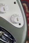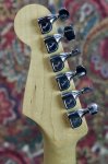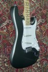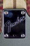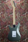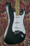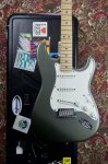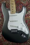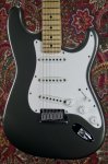 Excellent condition featuring double cutaway contoured alder body with Pewter finish, multi-ply parchment white and black pickguard, three single coil Stratocaster pickups with parchment white plastic covers, one volume control and two tone controls with parchment white skirted knobs, five way pickup selector switch with parchment white tip, oval shaped metal output jack plate, two point pivot tremolo bridge with six fully adjustable individual block saddles, maple neck with walnut skunkstripe, maple fingerboard with black dot inlays starting at the third fret, medium jumbo frets, bone nut, small Stratocaster peghead shape with Fender block logo, Stratocaster logo, Made in USA and serial number, two string trees, six in a line Fender stamped enclosed tuning machines, four bolt neck fastening plate with Fender logo engraving, multi-ply black and parchment white plastic tremolo cavity cover plate, two strap buttons and original black molded Fender hard shell case. This guitar weighs 7lb 10oz.