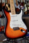 Excellent condition featuring double cutaway contoured alder body with three tone sunburst finish, multi-ply parchment white plastic pickguard, three Stratocaster single coil pickups with parchment white plastic covers, one volume control and two tone controls with white plastic skirted knobs, five way pickup selector switch with white plastic tip, elongated oval shaped output jack plate mounted on the front treble side of the body, six point pivot tremolo bridge with six individual fully adjustable Fender stamped bent steel saddles, bolt on maple neck with walnut skunkstripe, maple fingerboard with black dot inlays starting at the third fret, bone nut, small maple Stratocaster headstock shape with Fender block logo, Stratocaster logo, serial number and Made in Mexico on the peghead face, single butterfly string tree, six per side chrome sealed Fender stamped tuning machines, four bolt neck fastening plate, two metal strap buttons and black padded gig bag. This guitar weighs 7lb 12oz.