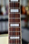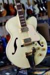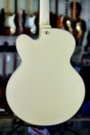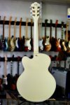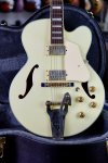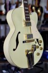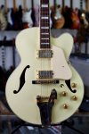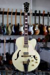 Excellent condition featuring laminate maple body with single round cutaway, Ivory finish throughout, multiple bound top and back edges, two oversized bound F holes, two humbucking pickups with cream colored plastic pickup surrounds and gold covers, two volume controls and two tone controls with gold speed knobs, three-way pickup selector switch with white plastic tip, Ibanez branded Bigsby style tailpiece, wooden bridge base with adjustable bridge and six roller saddles, single ply cream colored plastic elevated pickguard with metal mounting bracket, set mahogany neck, bound rosewood fingerboard with pearloid block inlays starting at the first fret, bound Ibanez Artcore shaped peghead with pearloid Ibanez logo and silver Artcore lightning bolt logo, triangular single ply black plastic truss rod cover, three per side gold sealed tuning machines with pearloid buttons, two metal strap buttons and black hard shell case.