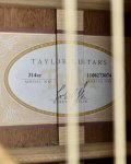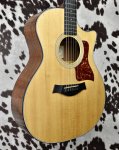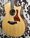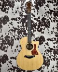 Good condition featuring Grand Auditorium body size with cutaway, solid spruce top with multiple bindings, decorative soundhole rosette and gloss finish, sapele back and sides with single black binding and satin finish, ebony Taylor belly bridge with ebony bridge pins, single ply pointed tortoiseshell grain pickguard, mahogany neck, ebony fingerboard with small pearl dot inlays starting at the third fret, 1 3/4" nut width, Taylor peghead shape, Indian rosewood peghead overlay with white Taylor logo, Indian rosewood bell shaped truss rod cover, three per side Taylor branded tuning machines, Expression System electronics with side mounted controls, endpin jack and black battery compartment, two metal strap buttons, and padded Taylor soft case.