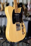 Excellent condition featuring figured pine body with gloss polyurethane Butterscotch Blonde finish, two Fender designed Alnico single coil pickups, one volume control and one tone control with steel knurled flat top barrel knobs and three way toggle switch mounted to elongated metal electronic control plate, single ply black pickguard, Fender style ashtray Telecaster bridge with three barrel saddles, maple C shape neck with walnut backstripe and tinted gloss finish, maple fingerboard with narrow jumbo frets and black dot inlays starting at the third fret, maple peghead with vintage gold and black Squier and Telecaster logos, single round 50s style string tree, six in a line vintage Kluson style tuning machines, four bolt neck fastening plate with Squier engraving, string through body construction with six metal string ferrules, two metal strap buttons, and nickel plated metal hardware. This guitar weighs 7lb 14oz.