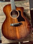 This 2020 Taylor guitar is in excellent nearly unplayed cosmetic condition showing no signs of visible play wear except for a few pickguard scratches. The neck carve is very comfortable in hand with a 1 3/4" nut width. The frets show no signs of play wear and have a lifetime of use left in them. This guitar is set up in fantastic playing order and has the bright crisp sound Taylors are famous for. The Koa used on this instrument has a very attractive grain that is straight on the front and a little curlier on the back and sides. This is a very fine acoustic/electric for stage, studio or home use.