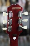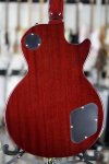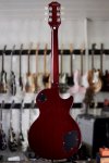 Excellent condition featuring left-handed single cutaway mahogany body with red stain finish, two-piece figured maple top with Bourbon Burst finish and cream binding (thin through the cutaway like a 50s Les Paul), two humbucking pickups with cream pickup surrounds, two volume controls and two tone controls with gold knobs, three way toggle switch with cream Rhythm and Treble ring, single ply cream elevated pickguard with chrome metal bracket, tune-o-matic bridge, stop tailpiece, mahogany neck with cherry red stain finish, bound Indian laurel fingerboard with trapezoid inlays starting at the third fret, redesigned Epiphone open book peghead, black peghead face with Epiphone logo and printed Les Paul Model logo, multi-ply bell shaped truss rod cover, three per side Epiphone Deluxe tuning machines with keystone buttons, serial number impressed in the back of the peghead, single ply black plastic electronics control cover plate and switch cover plate, and two metal strap buttons. The serial number of this guitar has been stickered over and there is a faint USED stamp on the back of the headstock but the guitar has no apparent flaws.