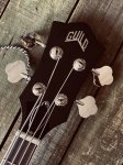 This bass features semi-hollow double cutaway body, arched mahogany top and back, mahogany sides, two unbound f-holes, multiple bindings on the top and back body edges, Guild BC-1 BiCoil pickups, master volume control and master tone control with black reflector top G shield knobs and push/pull "vintage" switch, tune-o-matic bridge, Guild harp tailpiece, mahogany modern thin U neck, Indian rosewood fingerboard with pearloid dot inlays and narrow tall frets, Guild vintage style open gear bass tuning machines, two metal strap buttons, nickel plated metal hardware, and Vintage Walnut gloss polyurethane finish.