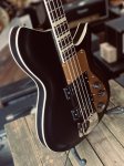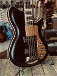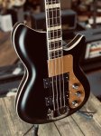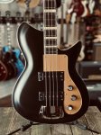This brand new bass from Rivolta features chambered mahogany body, German carve maple top, bound top and back, two custom wound Rivolta pickups, one volume control, one blend control and one tone control with small black reflector top knobs, chrome bridge cover, gold Plexi pickguard, set maple neck with medium C profile, bound ebony fingerboard with pearloid block inlays and medium jumbo frets, bound peghead with Rivolta logo, open gear tuners, gold Plexi triangular truss rod cover, Toro Black Satin finish, nickel plated metal hardware, two metal strap buttons, and padded gray Rivolta gig bag.