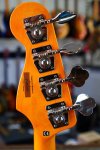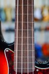 Excellent condition featuring asymmetrical double cutaway body with three tone sunburst finish, four ply tortoiseshell grain pickguard, metal control plate with three electronics controls, Fender Jazz Bass bridge with four individual barrel saddles, maple neck with walnut skunkstripe and vintage tint finish, fretless Indian laurel fingerboard with pearloid dot inlays starting at the third fret, open gear tuners, Squier by Fender vintage style gold logo and Jazz Bass logos, single round string tree, four bolt neck fastening plate with Squier engraving, and two metal strap buttons.